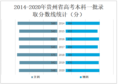 2020年贵州省高考本科一批文科录取分数线为548分,较2019年增加了6分;理科录取分数线为480分,较2019年增加了10分。