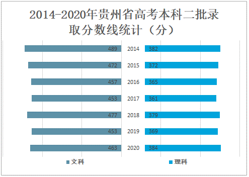2020年贵州省高考本科二批文科录取分数线为463分,较2019年增加了10分;理科录取分数线为384分,较2019年增加了15分。