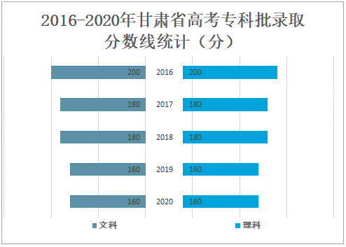 2020年甘肃省高考专科批文科录取分数线为160分,与2019年持平;理科录取分数线为160分,与2019年持平。