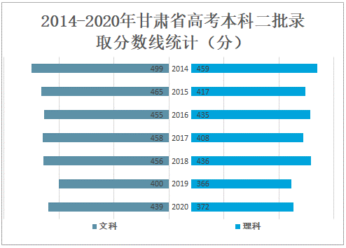 2020年甘肃省高考本科二批文科录取分数线为439分,较2019年增加了39分;理科录取分数线为372分,较2019年增加了6分。