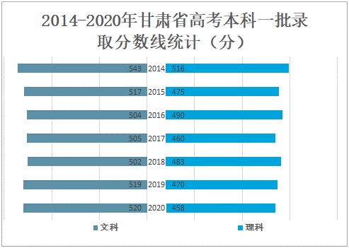 2020年甘肃省高考本科一批文科录取分数线为520分,较2019年增加了1分;理科录取分数线为458分,较2019年减少了12分。