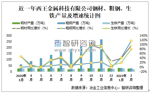 根据冶金工业信息中心数据显示:2021年2月西王金属科技有限公司钢材产量为25.4万吨,同比增长97.3%,粗钢产量为28万吨,同比增长117.7%,生铁产量为22.5万吨,同比增长80.9%;2021年1-2月西王金属科技有限公司钢材产量为55.54万吨,同比增长61.5%,粗钢产量为59.48万吨,同比增长69.9%,生铁产量为47.8万吨,同比增长42.6%。