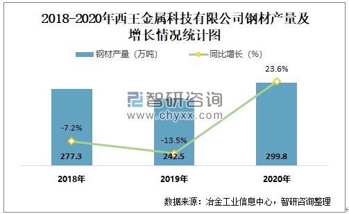 2018-2020年西王金属科技有限公司钢材产量及增长情况统计图