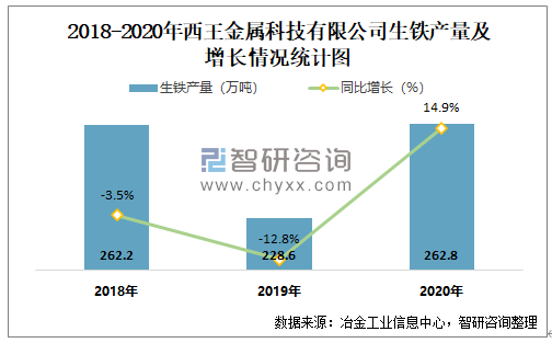 2018-2020年西王金属科技有限公司生铁产量及增长情况统计图
