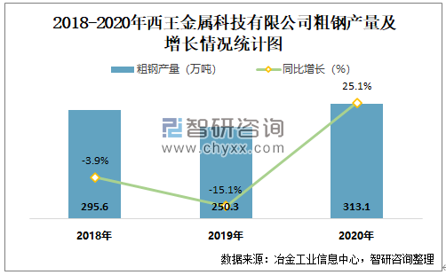 2018-2020年西王金属科技有限公司粗钢产量及增长情况统计图