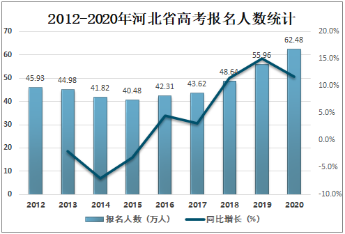 自2016年起河北省高考报名人数逐年攀升,2020年河北省高考报名人数达62.48万人,较2019年增加了6.52万人,同比增长11.7%。