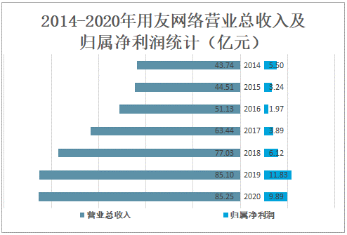 2014-2020年用友网络营业总收入及归属净利润统计(亿元)