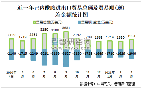 近一年中国己内酰胺进出口贸易总额及贸易顺(逆)差统计表