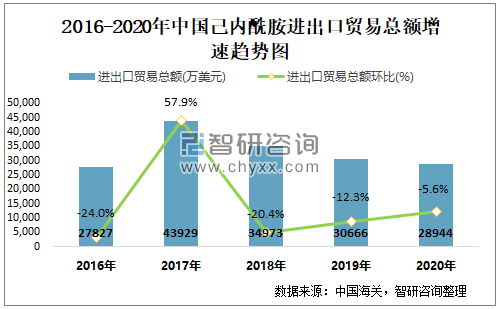2016-2020年中国己内酰胺进出口贸易总额增速趋势图