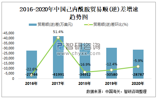 2016-2020中国己内酰胺贸易顺(逆)差增速趋势图