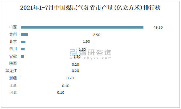 2021年1-7月中国煤层气各省市产量排行榜