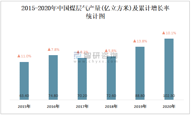 2015-2020年中国煤层气产量及增长情况统计图