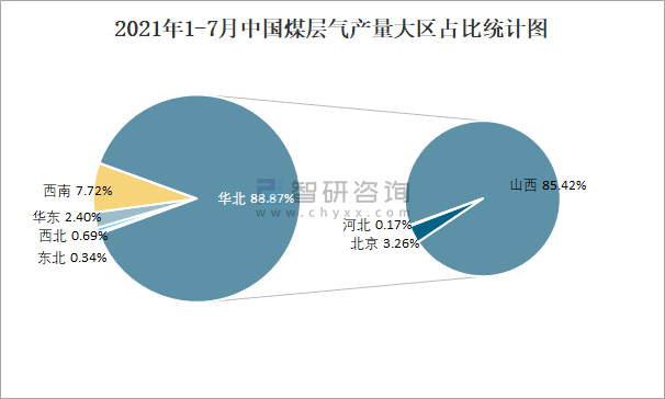 2021年1-7月中国煤层气产量大区占比统计图