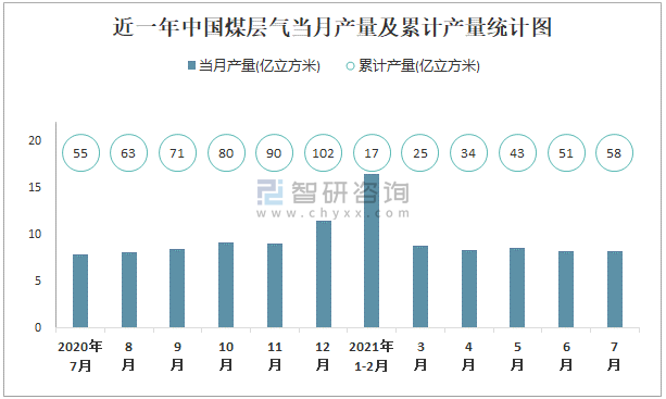根据国家统计局数据显示:2021年7月中国煤层气产量为8.2亿立方米,同比增长5.1%;2021年1-7月中国煤层气累计产量为58.4亿立方米,累计增长9%;2015-2020年中国煤层气产量2017年起逐年递增,2020年达到最高。