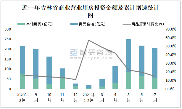 根据国家统计局数据统计可知:2021年7月吉林省房地产开发投资商品房投资金额为207.84亿元,其中包括办公楼、商业营业用房等其他用房57.04亿元(注:办公楼、商业营业用房未分开统计);2021年1-7月吉林省房地产开发投资包括商业营业用房在内的其他用房累计金额为257.63亿元。