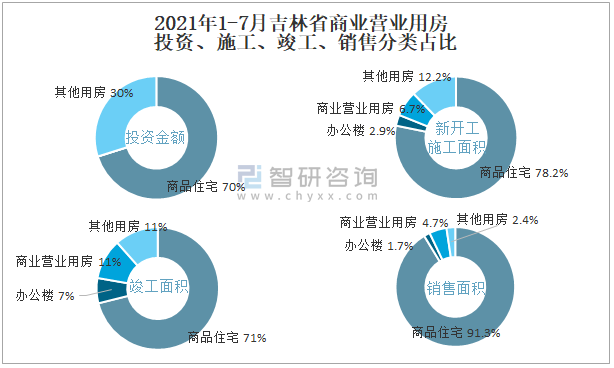 根据国家统计局数据统计可知:2021年1-7月吉林省房地产开发企业在包括商业营业用房在内的其他用房投资金额占比为29.9%(注:只有投资金额中其他用房包含办公楼、商业营业用房),商业营业用房的新开工面积与竣工面积所占比重差异不大,从销售面积来看,商业营业用房销售面积占比高于办公楼销售面积占比。