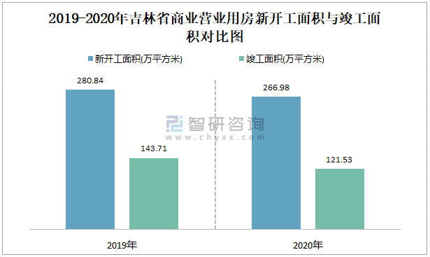 2019-2020年吉林省商业营业用房新开工面积与竣工面积对比图