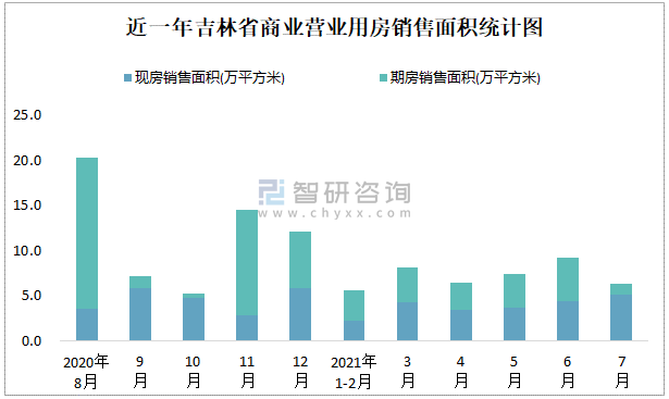 根据国家统计局数据可知:2021年7月吉林省商业营业用房销售面积为6.34万平方米(其中销售现房5.11万平方米,期房1.23万平方米);2021年1-7月吉林省商业营业用房累计销售面积为43.1万平方米;近一年吉林省商业营业用房期房销售面积远高于现房销售面积。