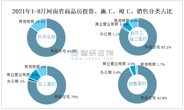 2021年1-8月河南省商品房投资、施工、竣工、销售分类占比