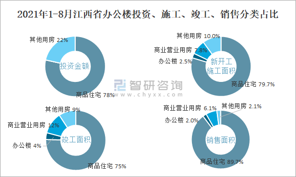 根据国家统计局数据统计可知:2021年1-8月江西省房地产开发企业在包括办公楼在内的其他用房投资金额占比为21.5%(注:只有投资金额中其他用房包含办公楼、商业营业用房),办公楼的新开工面积与竣工面积所占比重差异不大,从销售面积来看,办公楼销售面积占比少于商业营业用房销售面积占比。