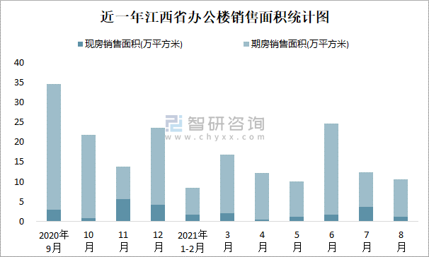 根据国家统计局数据可知:2021年8月江西省办公楼销售面积为10.58万平方米(其中销售现房1.07万平方米,期房9.51万平方米);2021年1-8月江西省办公楼累计销售面积为95.18万平方米;近一年江西省办公楼期房销售面积远高于现房销售面积。