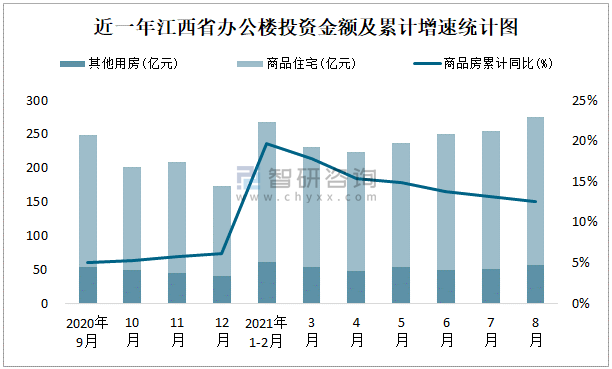 根据国家统计局数据统计可知:2021年8月江西省房地产开发投资商品房投资金额为275.04亿元,其中包括办公楼、商业营业用房等其他用房57.04亿元(注:办公楼、商业营业用房未分开统计);2021年1-8月江西省房地产开发投资包括办公楼在内的其他用房累计金额为374.96亿元。