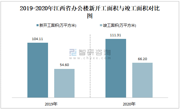 2019-2020年江西省办公楼新开工面积与竣工面积对比图