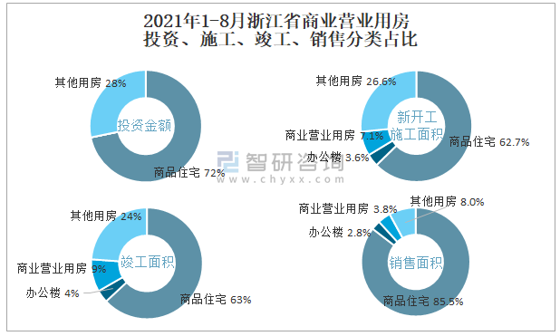 根据国家统计局数据统计可知:2021年1-8月浙江省房地产开发企业在包括商业营业用房在内的其他用房投资金额占比为28.2%(注:只有投资金额中其他用房包含办公楼、商业营业用房),商业营业用房的新开工面积与竣工面积所占比重差异不大,从销售面积来看,商业营业用房销售面积占比高于办公楼销售面积占比。