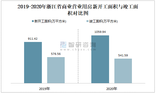 2019-2020年浙江省商业营业用房新开工面积与竣工面积对比图