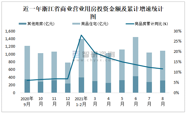 根据国家统计局数据统计可知:2021年8月浙江省房地产开发投资商品房投资金额为1093.43亿元,其中包括办公楼、商业营业用房等其他用房314.54亿元(注:办公楼、商业营业用房未分开统计);2021年1-8月浙江省房地产开发投资包括商业营业用房在内的其他用房累计金额为2308.05亿元。