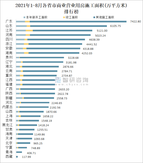 2021年1-8月各省市商业营业用房施工面积(万平方米)排行榜