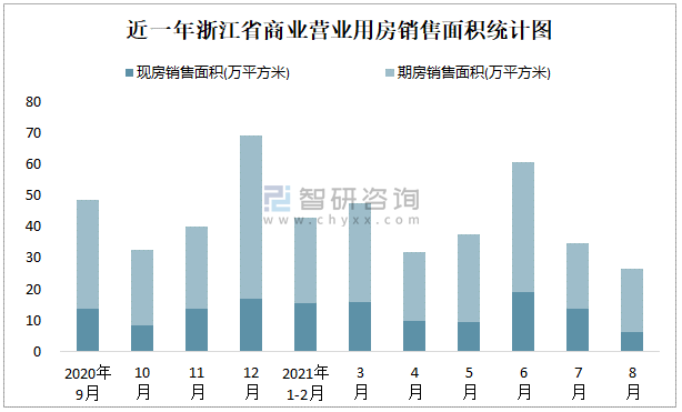 根据国家统计局数据可知:2021年8月浙江省商业营业用房销售面积为26.51万平方米(其中销售现房6.09万平方米,期房20.42万平方米);2021年1-8月浙江省商业营业用房累计销售面积为281.96万平方米;近一年浙江省商业营业用房期房销售面积远高于现房销售面积。