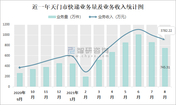 近一年天门市快递业务量及业务收入统计图