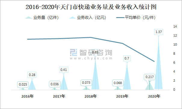 2016-2020年天门市快递业务量及业务收入统计图