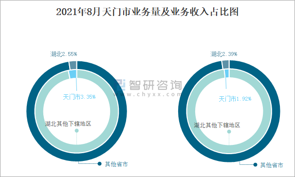 根据各省市邮政局数据可知:2021年8月天门市快递业务量占湖北快递业务量的3.35%,湖北快递业务量占全国快递业务量的2.55%;2021年8月天门市快递业务收入占湖北快递业务收入的1.92%,湖北快递业务收入占全国快递业务收入的2.39%。