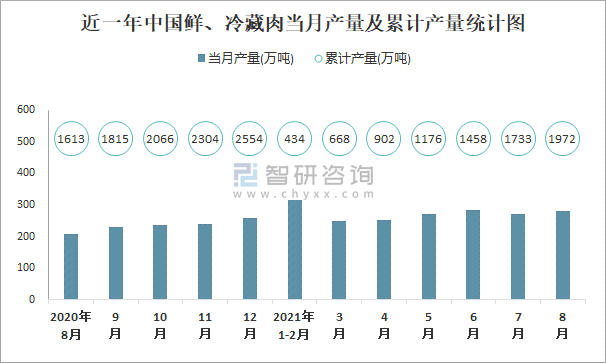 近一年中国鲜、冷藏肉当月产量及累计产量统计图