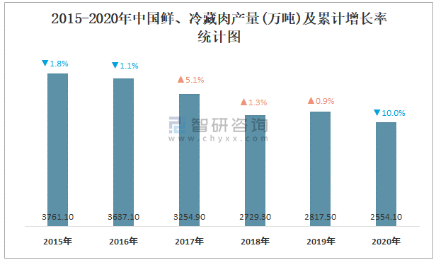 2015-2020年中国鲜、冷藏肉产量及累计增长率统计图