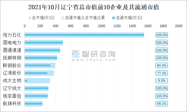 2021年10月辽宁省总市值前10企业及其流通市值