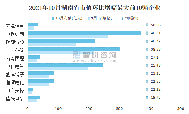 据同花顺统计数据可知:相较于2021年9月,湖南省10月有38家企业总市值呈现不同程度的增长,1家企业增幅超过50%,其中从事互联网电商行业的天泽信息增幅最大,增长58.56%,环比增幅最大的前10强企业中,从事国防军工行业的中兵红箭增量最大,总市值增加106.67亿元;4家企业总市值无明显变化;85家企业总市值环比出现下滑。
