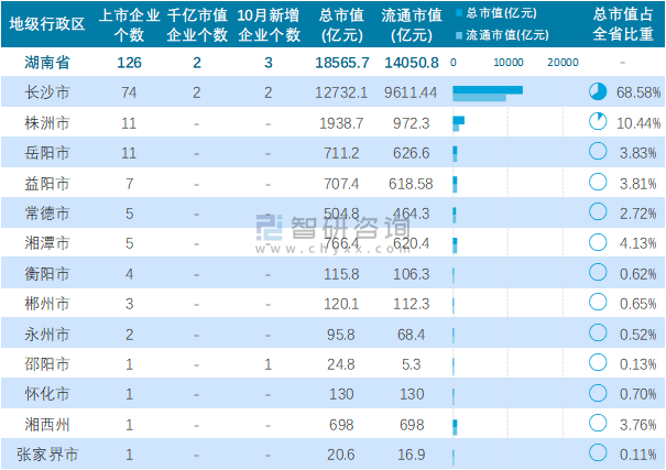 据同花顺统计数据可知:10月湖南省有3家企业新上市,截止至2021年10月31日,湖南省的A股上市企业共计126家,上市企业数量排名全国第10,总市值共计18565.7亿元;除娄底市1个地级行政区以外,湖南省其他13个地级行政区均有企业在A股上市,其中长沙市上市企业数量最多,为74家;湖南省的A股上市千亿市值企业数量在全国排名第16,共计2家,总部均在长沙市;长沙市A股上市企业总市值和总流通市值均为最高。