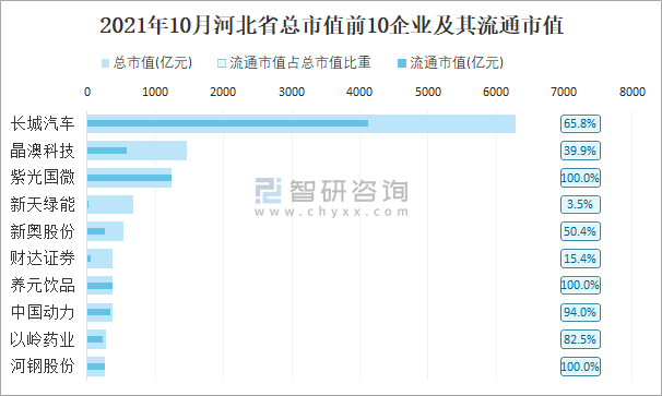 据同花顺统计数据可知:截止至2021年10月31日,河北省总市值最高的企业是长城汽车,主要从事汽车整车行业,总市值为6280亿元,其流通市值占总市值比重为65.76%;总市值排名前10的企业市值共计11814亿元,占全省总市值的71.13%。