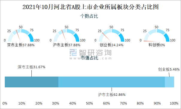 据同花顺统计数据可知:截止至2021年10月31日,河北省A股上市企业中在深市主板上市的企业数量最多,为25家,占全省A股上市企业数量比重为37.88%,在沪市主板上市的企业总市值最高,共计10441.4亿元,占全省A股上市企业总市值比重为62.86%,河北省暂无企业在科创板上市。
