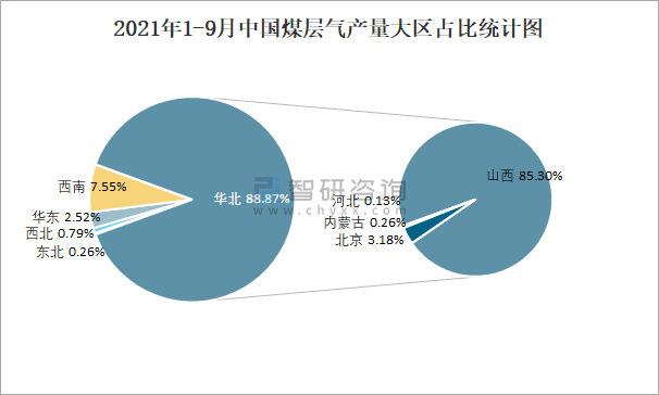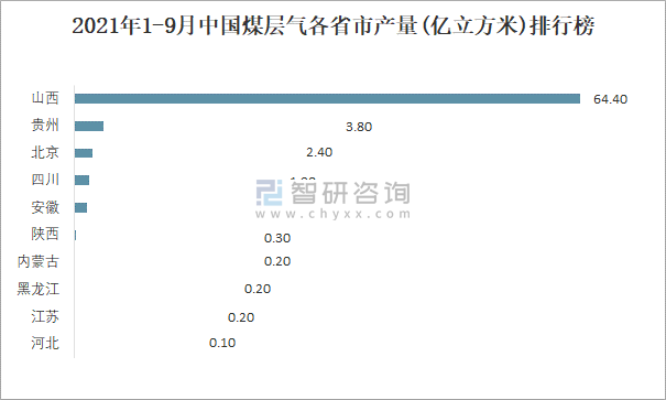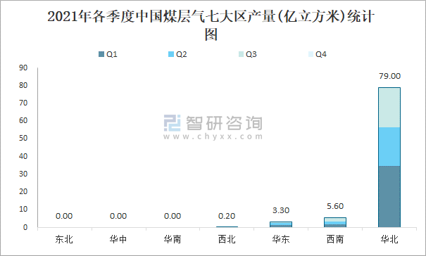 根据国家统计局数据显示:2021年各季度中国煤层气主要集中在华北、西南、华东地区生产;2021年1-9月中国煤层气产量大区分布不均衡,其中华北地区产量最高,特别是山西省贡献了最多产量;2021年1-9月中国煤层气各省市产量top1遥遥领先于其他省份