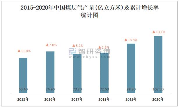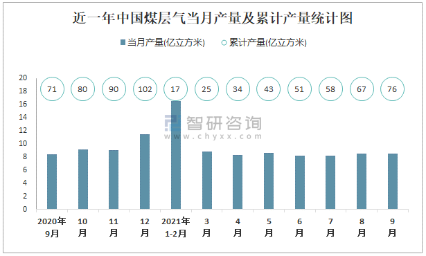 根据国家统计局数据显示:2021年9月中国煤层气产量为8.5亿立方米,同比增长4.4%;2021年1-9月中国煤层气累计产量为75.5亿立方米,累计增长8.4%;2015-2020年中国煤层气产量2017年起逐年递增,2020年达到最高。