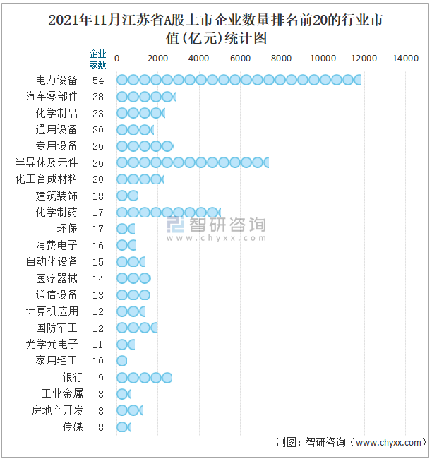 2021年11月江苏省A股上市企业数量排名前20的行业市值(亿元)统计图