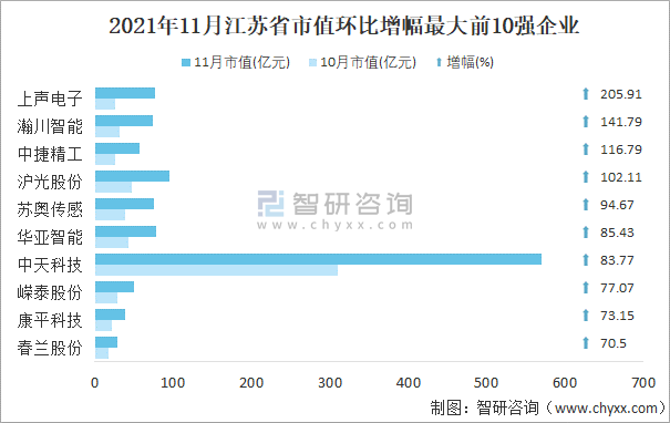 据同花顺统计数据可知:相较于2021年10月,11月江苏省有470家企业总市值呈现不同程度的增长,32家企业增幅超过50%,其中从事汽车零部件行业的上声电子增幅最大,增长205.91%,环比增幅最大的前10强企业中,从事通信设备行业的中天科技增量最大,总市值增加259.7亿元;20家企业总市值无明显变化;75家企业总市值环比出现下滑。