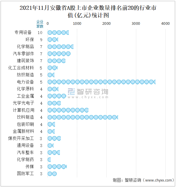 2021年11月安徽省A股上市企业数量排名前20的行业市值(亿元)统计图