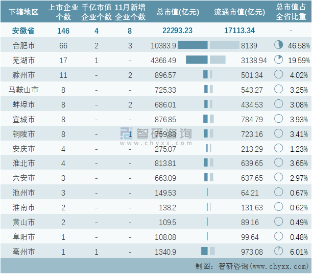据同花顺统计数据可知:11月安徽省新增8家企业在A股上市,截止至2021年11月30日,安徽省的A股上市企业共计146家,上市企业数量排名全国第9,总市值共计22293.23亿元;除宿州市1个地级行政区以外,安徽省其他15个地级行政区均有企业在A股上市,其中合肥市上市企业数量最多,为66家;安徽省的A股上市千亿市值企业数量在全国排名第8,共计4家,分布在芜湖市、合肥市、亳州市3个地区,其中合肥市千亿市值企业最多,为2家;合肥市A股上市企业总市值总流通市值均为最高。