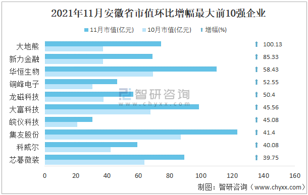 据同花顺统计数据可知:相较于2021年10月,11月安徽省有105家企业总市值呈现不同程度的增长,5家企业增幅超过50%,其中从事金属新材料行业的大地熊增幅最大,增长100.13%,环比增幅最大的前10强企业中,从事化学制品行业的华恒生物增量最大,总市值增加40.49亿元;8家企业总市值无明显变化;33家企业总市值环比出现下滑。