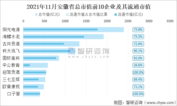 据同花顺统计数据可知:截止至2021年11月30日,安徽省总市值最高的企业是阳光电源,主要从事电力设备行业,总市值为2398.33亿元,其流通市值占总市值比重为73.8%;总市值排名前10的企业市值共计10292.58亿元,占全省总市值的46.17%。
